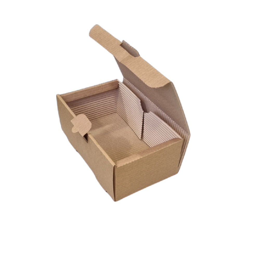 Οικολογική βιοδιασπώμενη και κομποστοποιήσιμη συσκευασία, κατασκευασμένη από πρωτογενές χαρτόνι, με κυματοειδές χαρτί χωρίς εσωτερική επίστρωση πολυαιθυλενίου (PE), διαστάσεων 22cm x 13cm x 8.3cm. Συσκευασία κιβωτίου 1 πακέτο των 100 τεμαχίων.