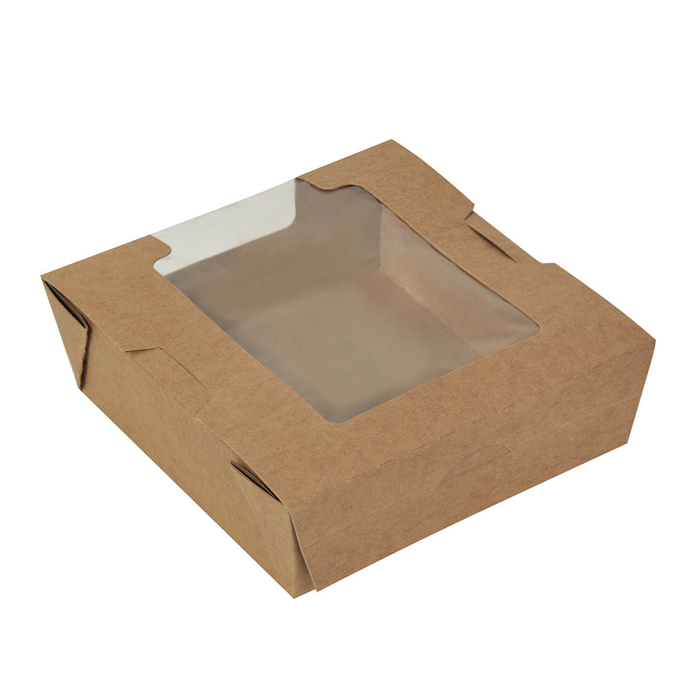 Χάρτινο κουτί, που δεν χρειάζεται συναρμολόγηση (easy open) για μεταφορά φαγητού, με διαφανές καπάκι, διαστάσεων 13cm x 13cm x 5cm. Ιδανικό για μεσαία σαλάτα.