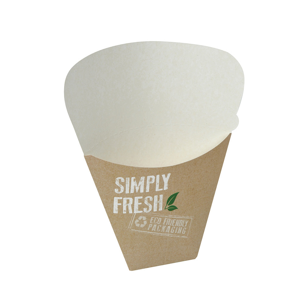 Οικολογική βιοδιασπώμενη συσκευασία, κατασκευασμένη από χαρτόνι , με εσωτερική επίστρωση PE για αδιαβροχοποίηση και αντοχή στα έλαια, διαστάσεων 6cm x 18,5cm. Δεν χρειάζεται συναρμολόγηση (easy open). Ιδανική για κρέπα στο χέρι.