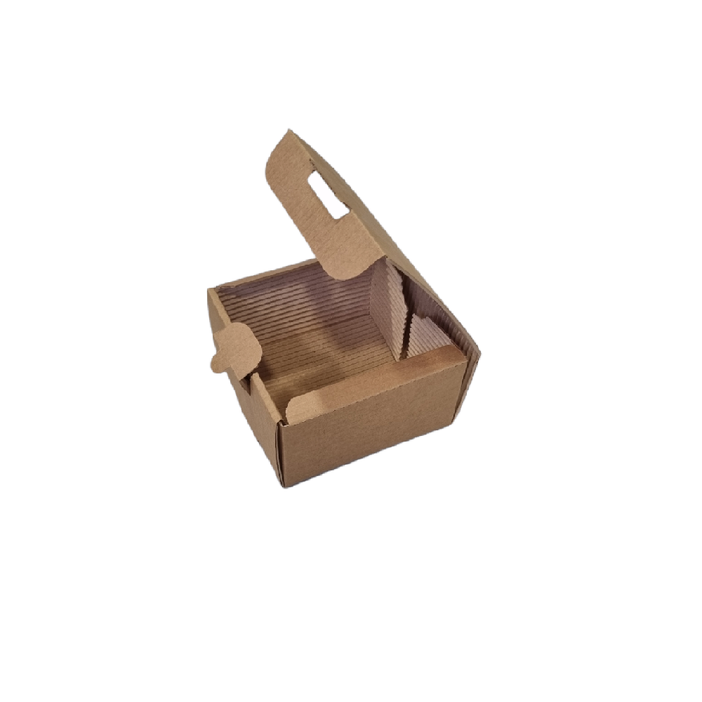 Οικολογική βιοδιασπώμενη και κομποστοποιήσιμη συσκευασία, κατασκευασμένη από πρωτογενές χαρτόνι, με κυματοειδές χαρτί χωρίς εσωτερική επίστρωση πολυαιθυλενίου (PE), διαστάσεων 13cm x 13cm x 7cm. Συσκευασία κιβωτίου 1 πακέτο των 100 τεμαχίων.