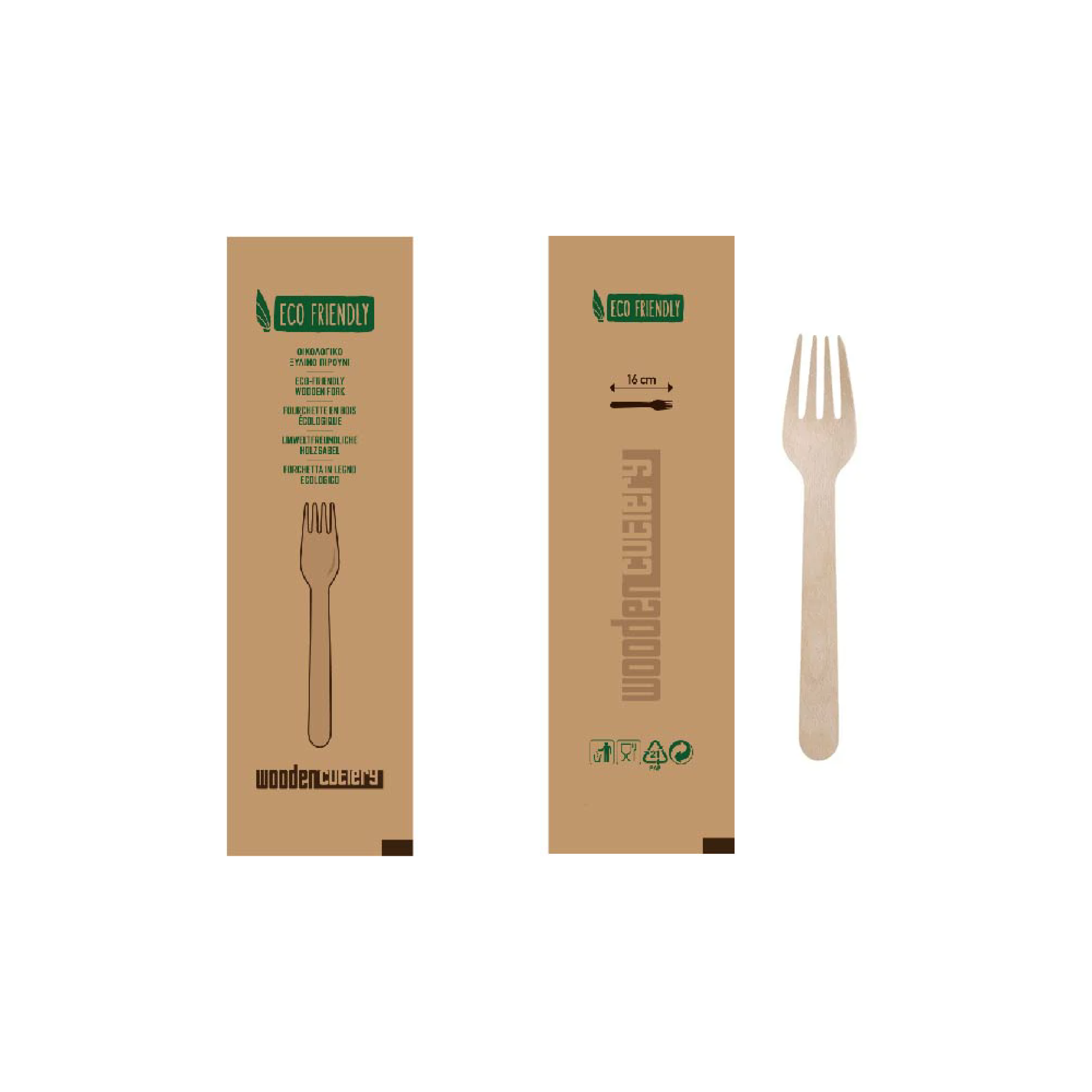 Ξύλινο πιρούνι μιας χρήσης 16 cm, σε ατομική εκτυπωμένη χάρτινη συσκευασία. Κατάλληλο για επαφή με τρόφιμα.